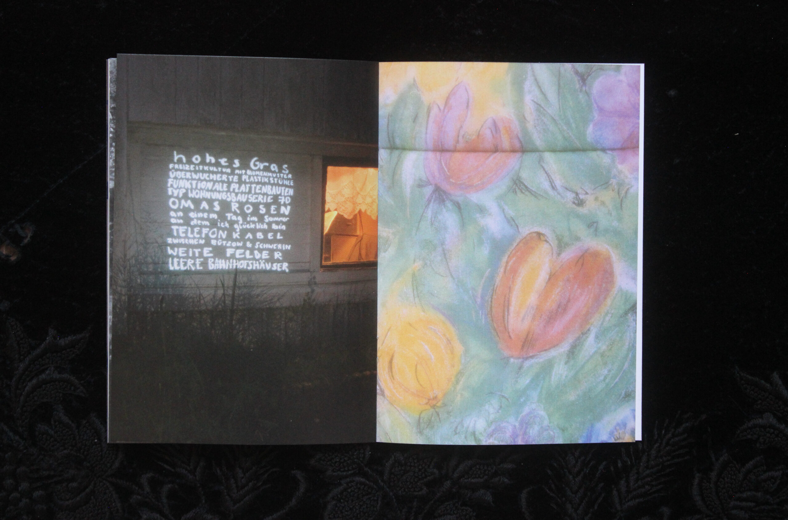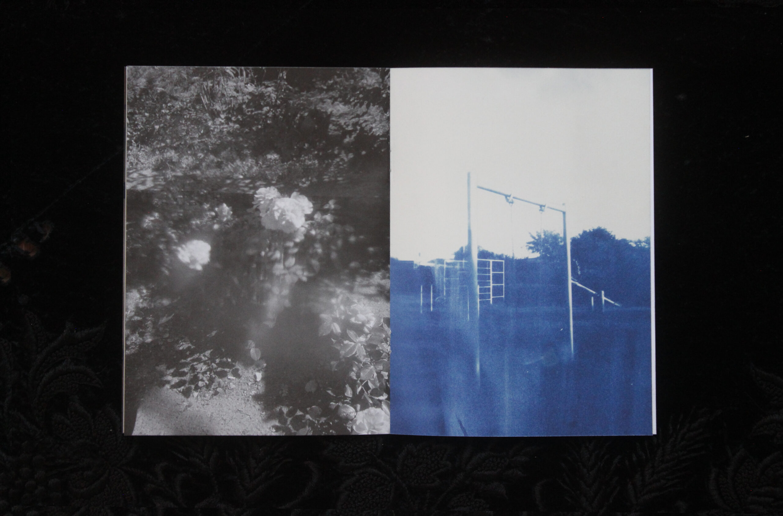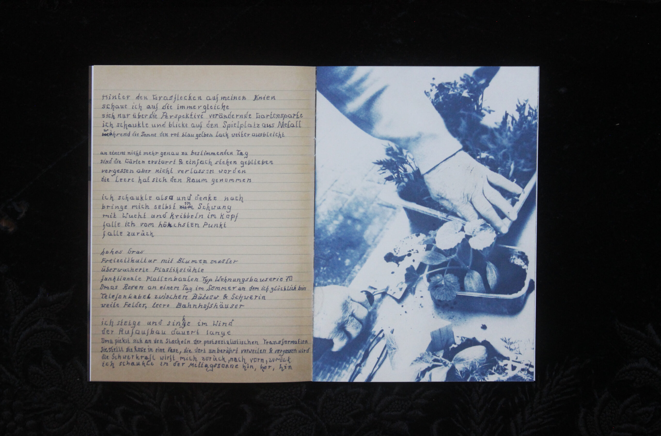 In der Publikation sind eine Fotoreihe, darauf basierende Cyanotypien und ein Gedicht enthalten. Ich versuche damit die Eindrücke und Gefühle während des Schaukelns mit Blick auf Gartensparte zu verarbeiten; Beobachtungen der Umgebung, Erinnerungen an den Garten meiner Großeltern und Gedanken daran, wie die historische Vergangenheit
